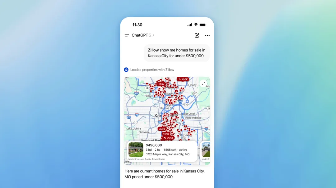 ChatGPT 还会在对话内容相关时主动推荐应用。例如,当你在讨论买房时,ChatGPT 可能会自动推荐 Zillow 应用,让你直接在对话中通过交互式地图浏览符合预算的房源。
