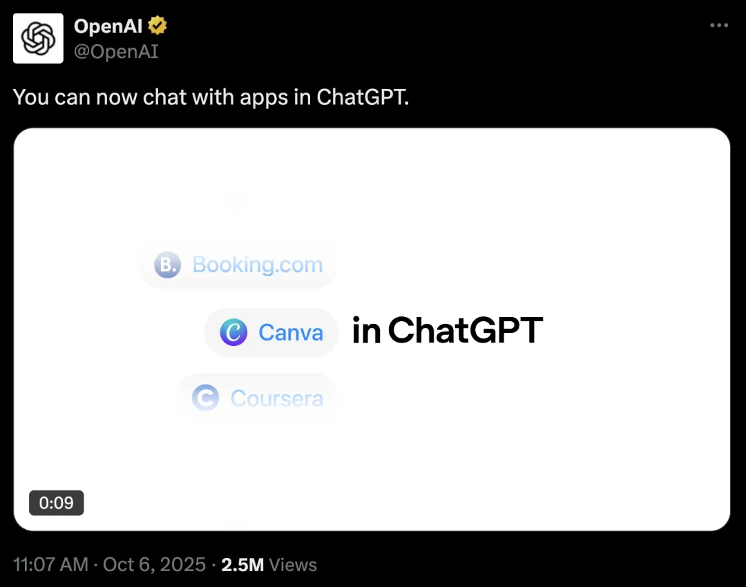 OpenAI 官方称,开发者现在可以使用 Apps SDK(应用开发工具包)开始构建这些应用。
